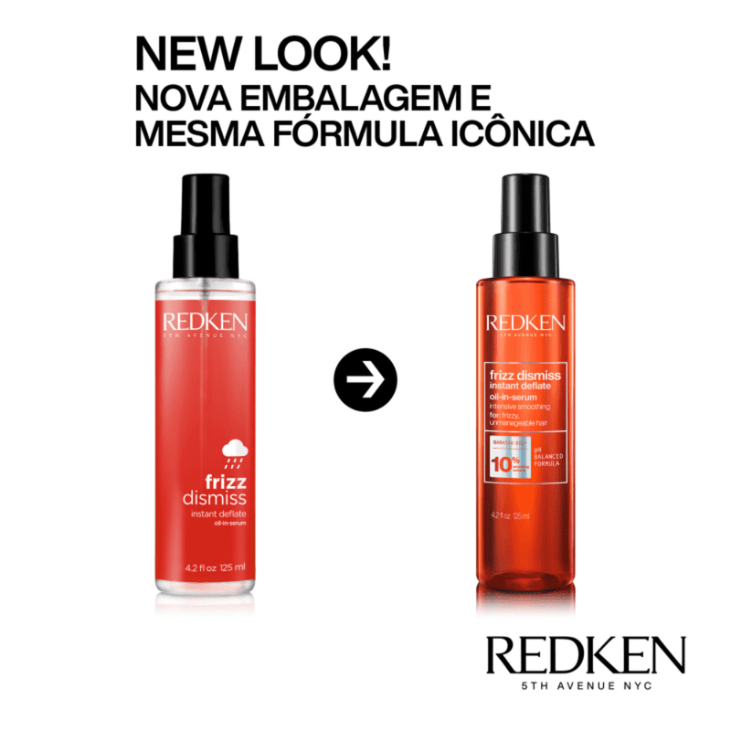 Redken Frizz Dismiss Instant Deflate Oil-In-Serum para cabelos com frizz que disciplina fios volumosos, controla os efeitos da umidade, proporciona suavidade, toque sedoso e brilho saudável, facilitando o manejo dos cabelos indisciplinados.