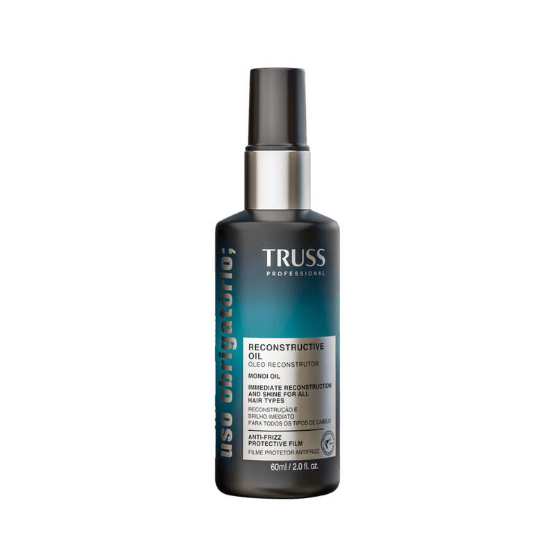 O Óleo Reconstrutor TRUSS Uso Obrigatório é um produto multifuncional que oferece reconstrução imediata, hidratação profunda e proteção contra danos térmicos, químicos e ambientais. Com Óleo de Monoi, proporciona maciez, flexibilidade e controle do frizz, além de proteger contra danos térmicos de até 230°C.
