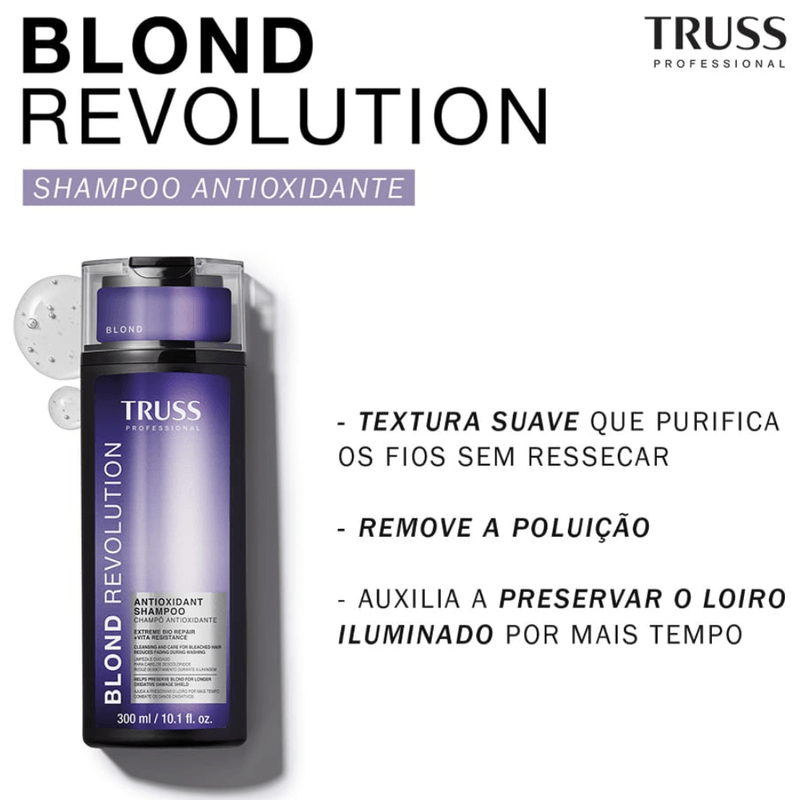 O Shampoo TRUSS Blond Revolution é ideal para cabelos loiros ou descoloridos, oferecendo limpeza suave e proteção contra danos oxidativos. Com ação antioxidante, ajuda a preservar a cor e reduzir o desbotamento, mantendo os fios iluminados e saudáveis.