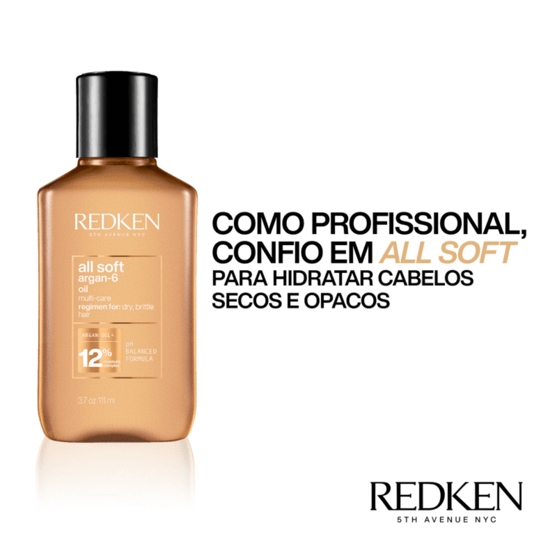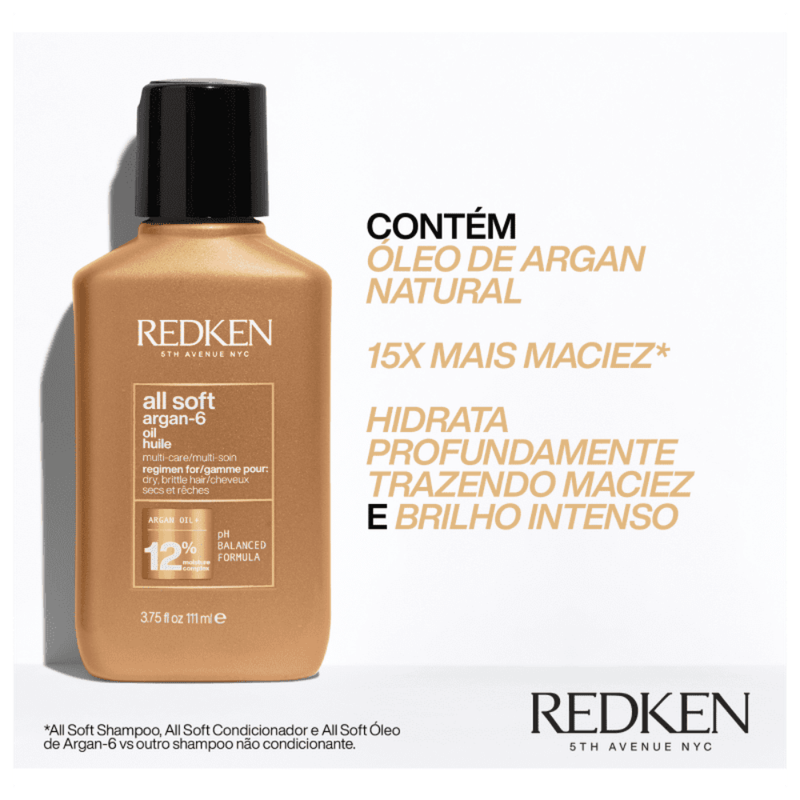 Redken All Soft Argan-6 Óleo Capilar nutre e restaura cabelos secos e opacos, proporcionando maciez intensa e brilho radiante. Enriquecido com Óleo de Argan, hidrata profundamente a fibra capilar e oferece múltiplas formas de uso: como primer antes do shampoo, proteção térmica durante a secagem, finalizador para suavizar os fios ou para intensificar o brilho.