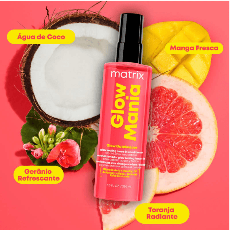Matrix Glow Mania Leave-in Spray condiciona e protege os fios coloridos, preservando a intensidade da cor e revelando um brilho luminoso imediato, comparável ao de um diamante. Sua fórmula leve combina Ácido Glicólico e Óleo de Rosa Mosqueta para prolongar a vitalidade, selar a cutícula e manter a hidratação sem pesar.